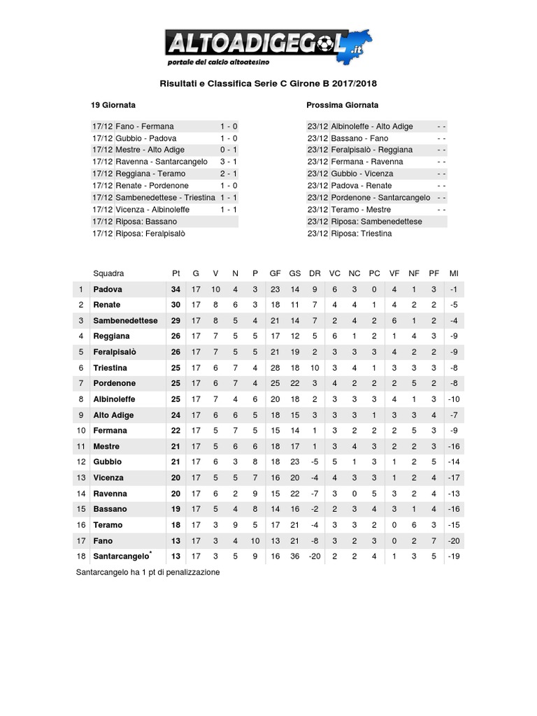 Ecco il programma della 28ª giornata della serie c 2017/2018 e le classifiche dei tre gironi risultati e classifica girone b.